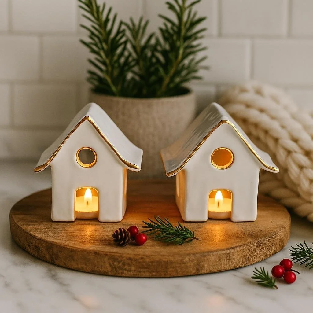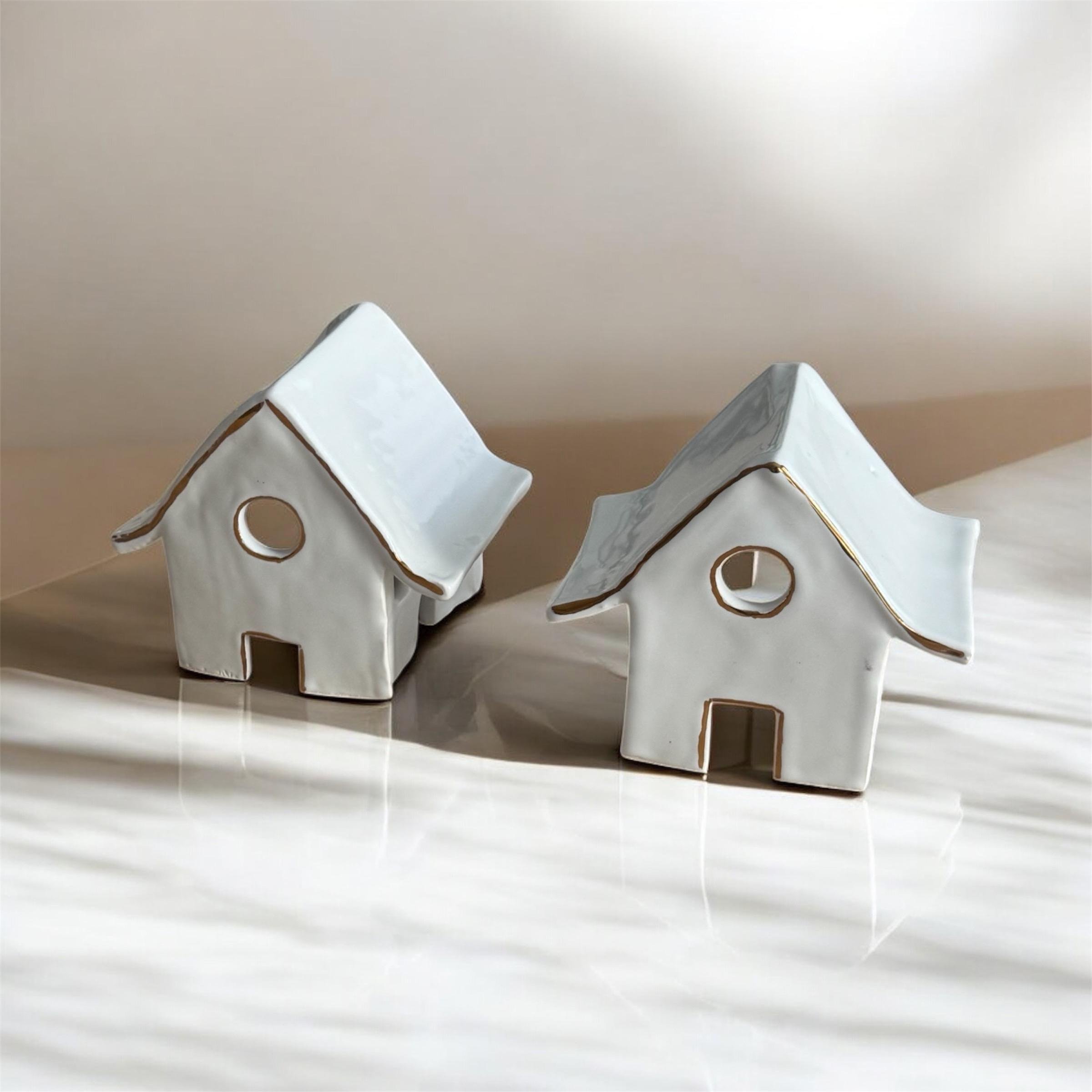 These charming hand-built mini houses are crafted individually in my studio, each one shaped with soft lines and finished in a smooth matte white glaze. The delicate 24k gold trim along the roof and windows adds a warm, elegant glow—perfect for holiday styling, yet timeless enough to enjoy all year round.