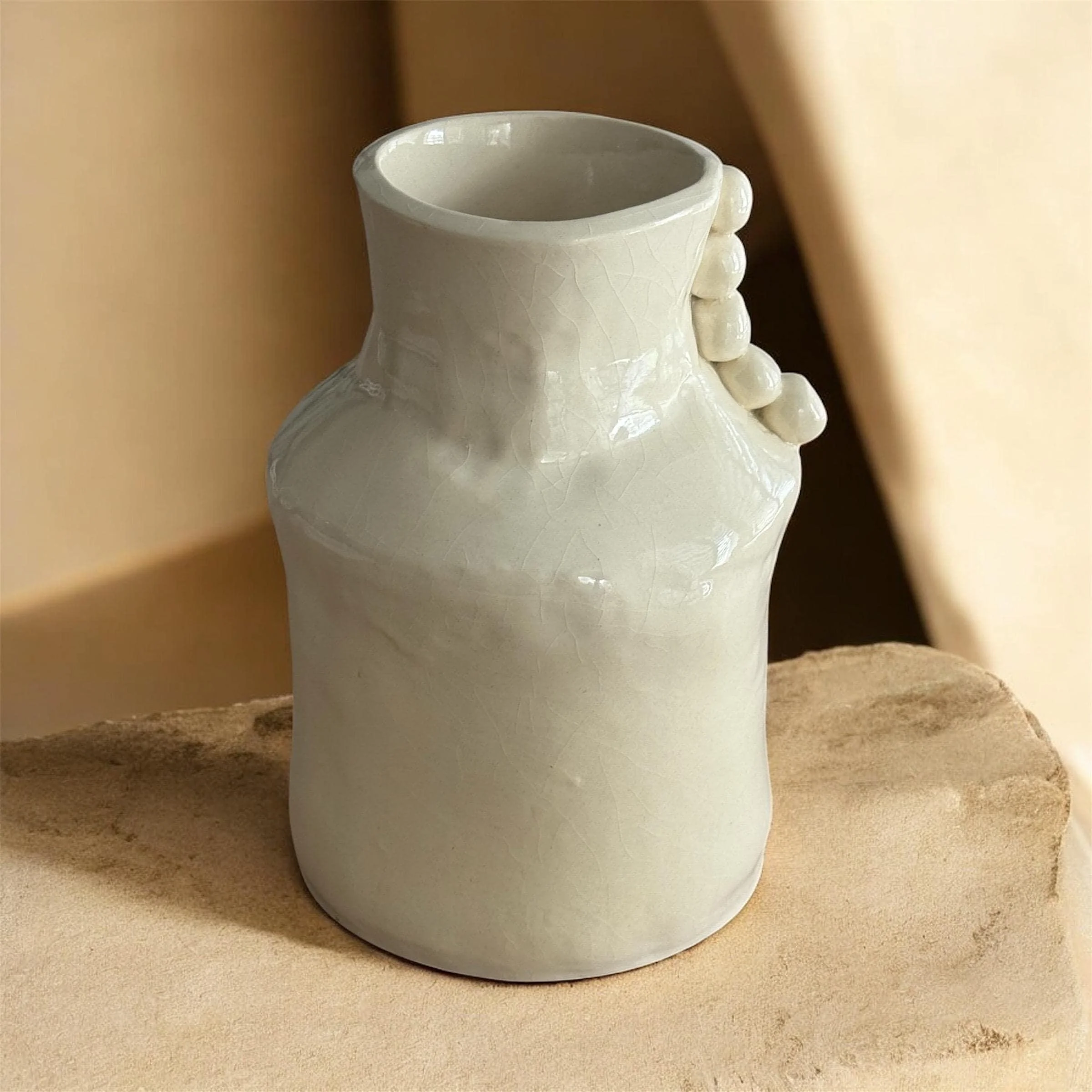A hand-built ceramic vase in a soft buttercream gloss glaze with delicate crackle details that catch the light beautifully. The sculptural beaded line along the neck adds a playful, modern touch while keeping the form simple and elegant. Perfect for everyday flowers, a styled coffee table, or as a special holiday / Christmas gift.