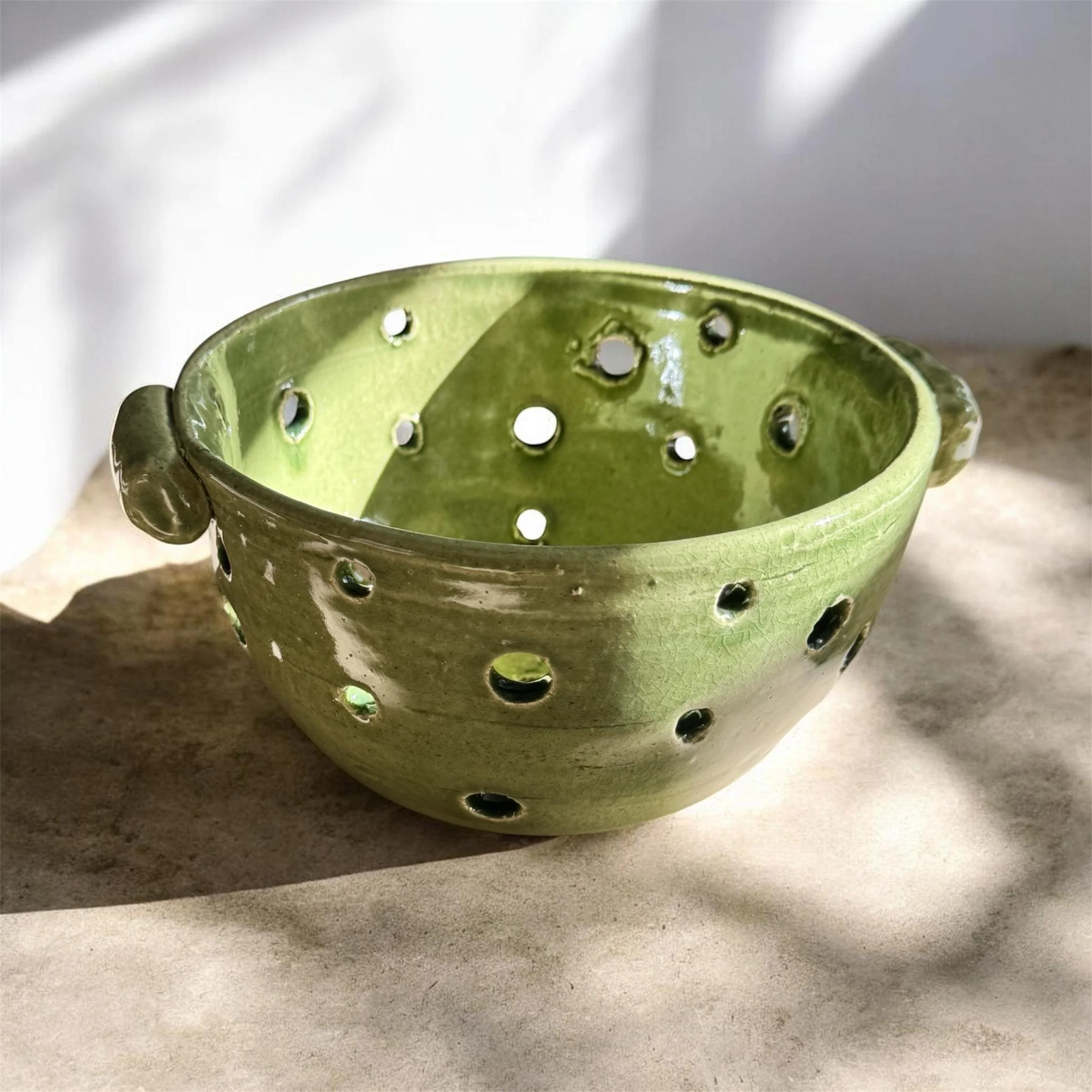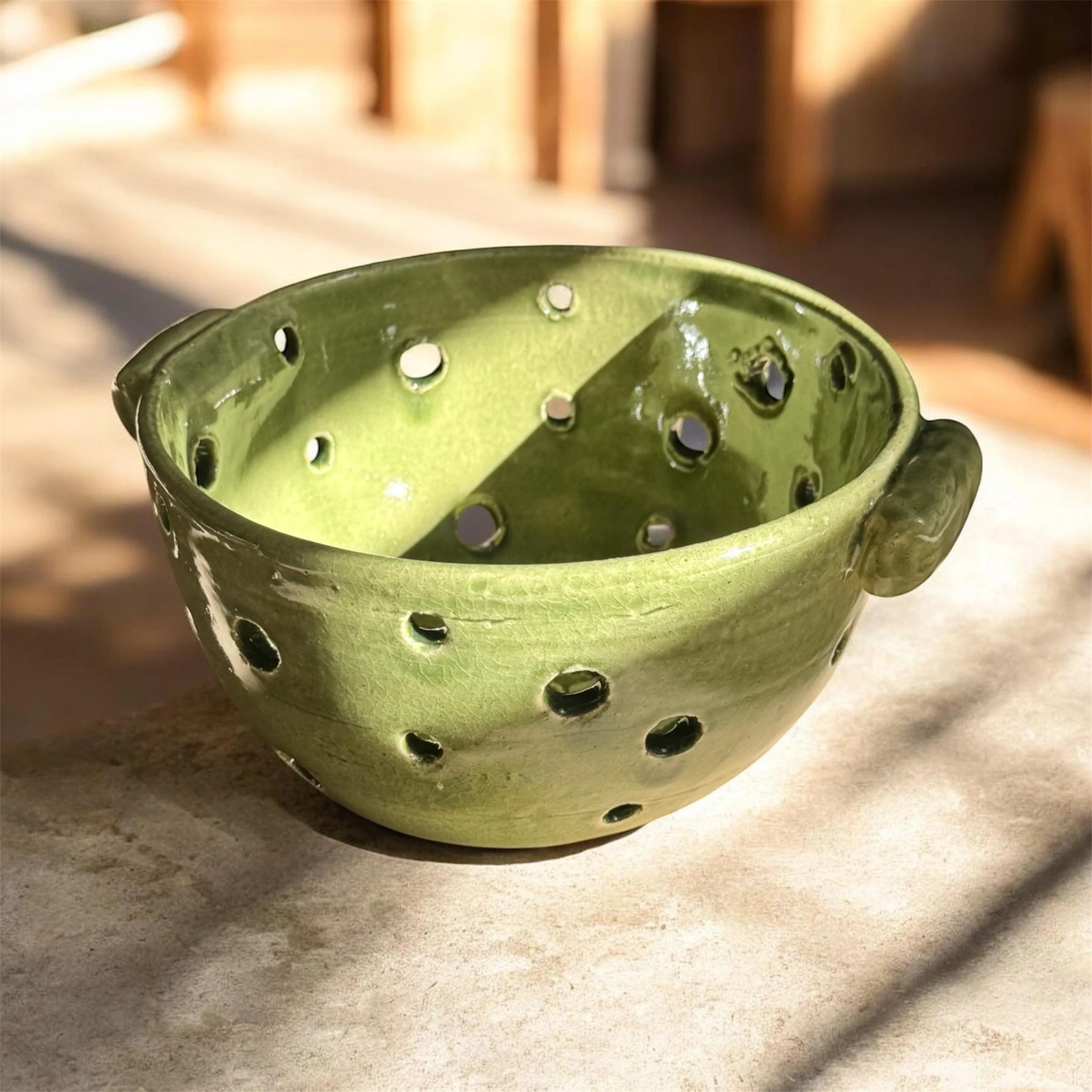 The softly rounded body and hand-finished perforations make it both functional and beautiful ,perfect for washing fruits, vegetables, or even serving fresh produce in style. The natural glaze and texture add warmth and charm to any kitchen setting.